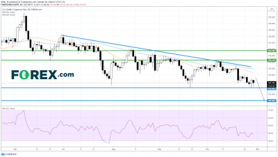 今天早上的官方數(shù)據(jù)顯示,日本9月失業(yè)率持平于3.0%,低于3.1%的預(yù)期值。與此同時(shí),工業(yè)產(chǎn)出月率上升4.0%,好于上升3.0%的預(yù)期值。技術(shù)面看,美元/日元日?qǐng)D受制于一根下降趨勢(shì)線與下降的50天均線(藍(lán)色線)。讀者或因此考慮在水平阻力位1