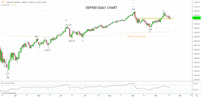 周三,美國(guó)股市震蕩后小幅下跌。道瓊斯工業(yè)平均指數(shù)下跌98點(diǎn)(-0.35%)至28210;標(biāo)普500指數(shù)下跌7點(diǎn)(-0.22%)至3435;納斯達(dá)克100指數(shù)下跌12點(diǎn)(-0.11%)至11665。標(biāo)普500指數(shù)(日線圖):3390上方看漲來